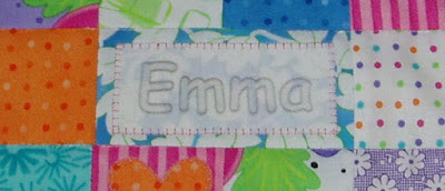 Here is the quilt measuring 16" x 20" and below is how Lily will always know that her doll's name is Emma!!